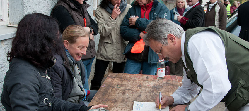 Auch in diesem Jahr waren es ca. 30 Reiter, die an dem Speltakel teilnahmen. Die zahlreichen Zuschauer begleiteten das Feld, unterhalten durch die Jagdhornbläsergruppe des Reitvereins, die das Feld an ausgewählten Punkten immer wieder musikalisch empfing. Vor dem Start der Jagd bekamen die Reiter einen so genannten Bügeltrunk auf eine „Gute Jagd“. Der Jagdherr, Ralf Multrus, hieß die teilweise sehr weit angereisten Teilnehmer herzlich willkommen, gab ein paar Hinweiße bezüglich der Verhaltensregeln im Gelände und übergab das Wort an den Führer der Hundemeute Herrn Dr. Winfried Veitinger. Auch er wünschte allen eine unfallfreie und „Gute Jagd“. Die Stimmung unter Reitern und Zuschauern war ausgesprochen fröhlich und auch die Bodenverhältnisse waren hervorragend, was ein ausgelassenes Reiten ermöglichte. Alle Reiter und Pferde waren geübt und so ergab alles ein harmonisches Bild. Bei der Hälfte der Strecke gab es eine kurze Rast. Dort wurden Reiter und Zuschauer mit Köstlichkeiten zur Stärkung wie Glühwein, Punsch, Nussstriezel und Wurstwecken verpflegt. Ohne ungeplante Zwischenfälle endete die Strecke im Mosteltal mit dem Ritt um das Feuer. Ralf Multrus bedankt sich bei allen Teilnehmern, Helfern und Zuschauern für ihren Beitrag zum guten Verlauf der Jagd. Er dankte auch Herrn Dr. Winfried Veitinger und seinem Equipage-Team des SHC für deren Kommen und den reibungslosen Ablauf. Als Zeichen für die erfolgreiche Teilnahme an der Jagd erhielten die Reiter den traditionellen Bruch, ein Tannenzweig mit rotem Band. Die Hunde wurden für ihre beeindruckende Leistung mit Curèe belohnt. Zum anschließenden Hock auf der Anlage der Reitschule Multrus kam sogar noch die Sonne zum Vorschein. Es trafen sich Reiter, Helfer und Zuschauer, um bei deftiger Kost und Bewirtung durch die Mitglieder des Reitvereins vor und im Reiterstüble den erfolgreichen Tag ausklingen zu lassen. Bei fröhlicher Stimmung wurde auf einen gelungenen Tag angestoßen und der eine oder andere freut sich schon auf ein Wiedersehen im nächsten Herbst.